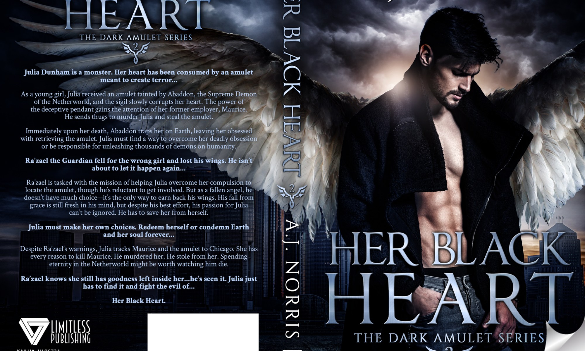 HER BLACK HEART by A.J. Norris The Dark Amulet Series, Book #2 Genre: Paranormal Tagline: “Redemption is worth the fight. Even if it means risking her heart.” Cover Designer: DERANGED DOCTOR DESIGNS —— SYNOPSIS —— Julia Dunham is a monster. Her heart has been consumed by an amulet meant to create terror… As a young …