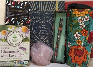 1st Prize (US only): Tea & Contemplation, a collection of favorite things, starts with an uplifting message from “Seize the Day” Pop Open Cards. Fill a ceramic thermal mug to sip Lavender Chamomile Tea while you contemplate your ideas and dreams. Write your thoughts in a journal, whose guiding words are: When Your Heart Speaks… take good notes! A Wish pen is included. Finally, pick a place to display a large piece of gemmy rose quartz, a stone long linked to matters of the heart. It’s said when rose quartz is nearby, love (of all kinds) comes along to keep it company. These items will be arranged in a “keeper box” and delivered to your door.