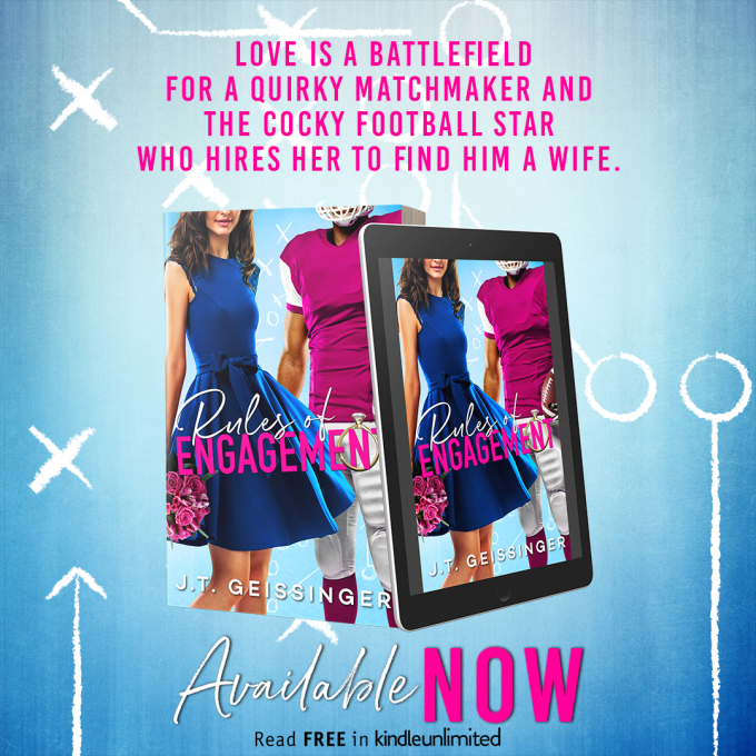 Love is a battlefield for a quirky matchmaker and the cocky football star who hires her to find him a wife. Rules of Engagement, an all-new laugh-out-loud standalone sports romance from J.T. Geissinger, is available now! As the owner of Perfect Pairings matchmaking service, Maddie McRae earns her living helping others fall in love. Dubbed …