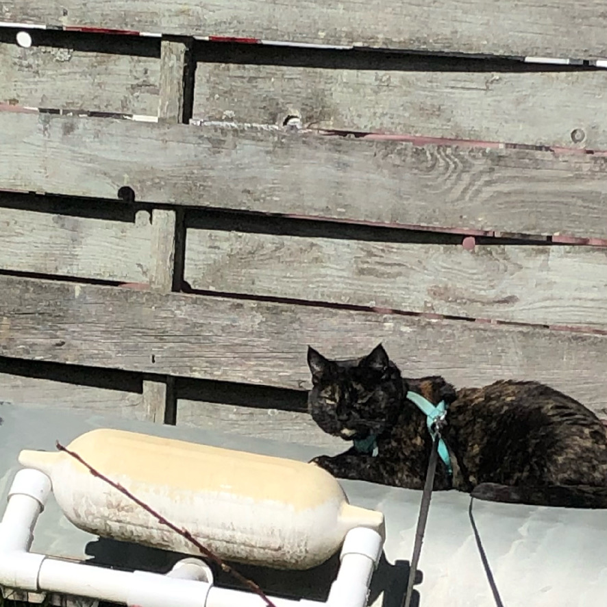 Harley soaking up the sun on the gray kayak against a cedar fence.
